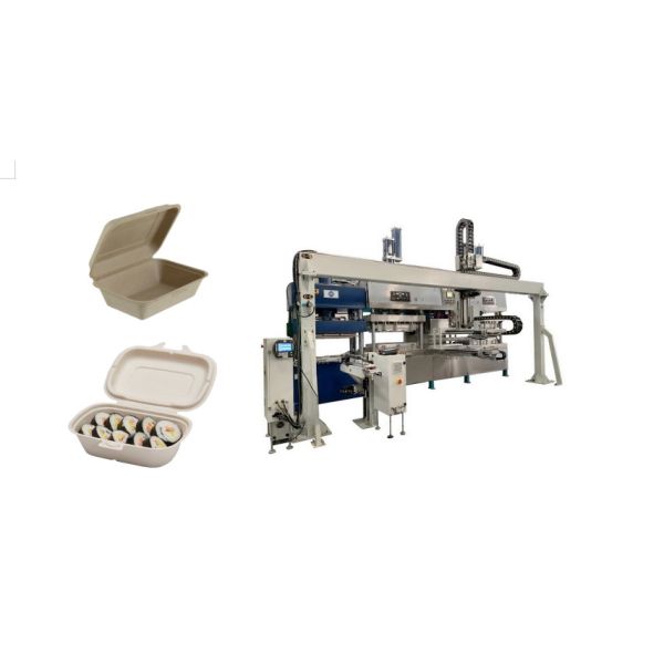 The machine is designed for both thermoforming and wet pressing, allowing for the production of various paper pulp molded products. It is equipped with automatic loading and unloading systems, as well as an easy-to-use interface for efficient operation.